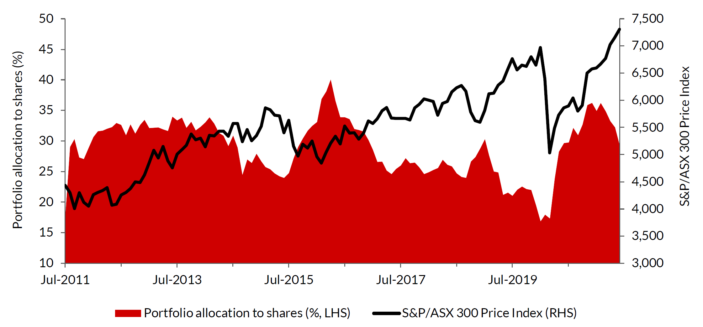 At the end of June, the Fund had around 29% invested in ASX-listed securities, versus around 35% at the end of the previous quarter. The remainder is held in cash and money market investments. This can be seen in the graph below, which shows our allocation between cash and shares over time.
