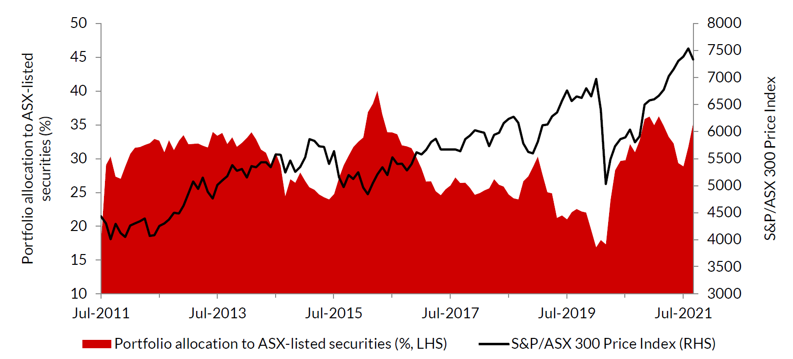 As at the end of September, the Fund had around 35% invested in ASX-listed securities (of which around 32% was shares and almost 3% selected hybrid securities). The remaining 65% is held in cash and money market investments. This can be seen in Graph 1, which shows our allocation between cash and ASX-listed securities over time.