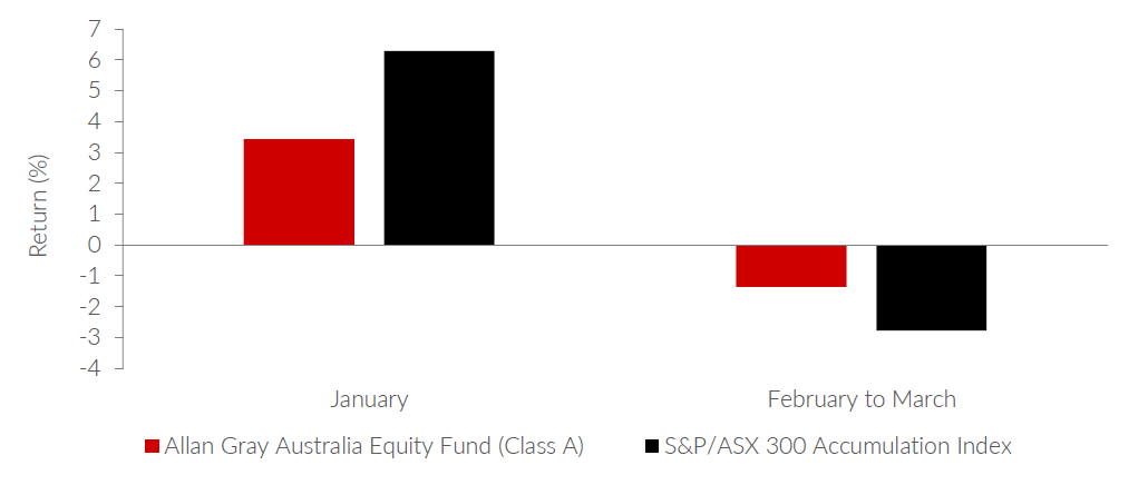 The Australian share market rose during the March quarter, albeit with some fluctuation, with the S&P/ASX 300 Accumulation Index finishing up 3.3%. Strong gains in January gave way to a weaker finish, as the index fell in both February and March. The Allan Gray Australia Equity Fund (Class A) was up 2.0% this quarter, underperforming the benchmark. It is worth noting that most of the underperformance came in the rising market of January. The Fund actually outperformed the benchmark from the end of January to the end of March, as shown in Graph 1.