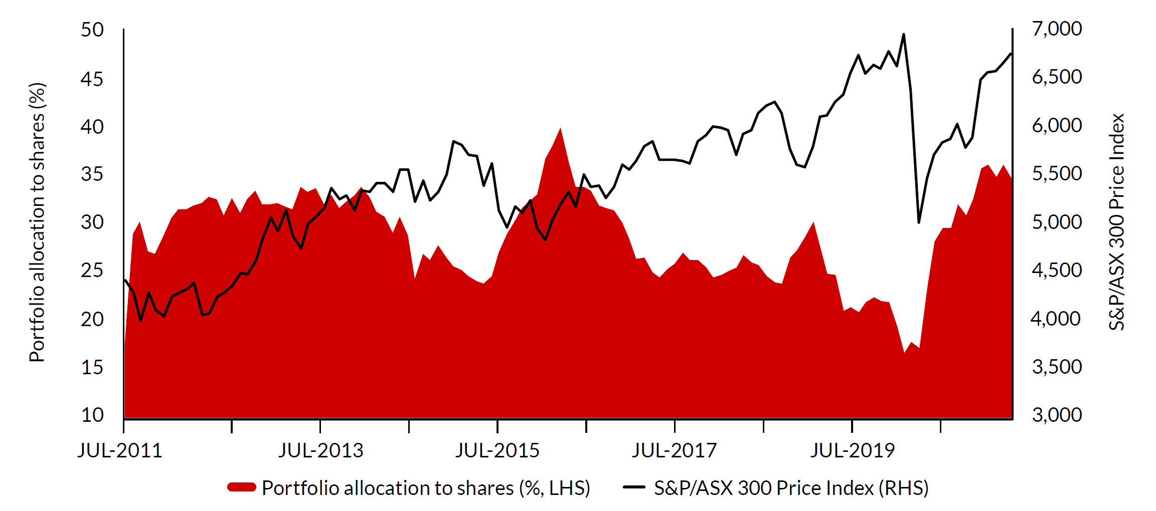 As at the end of March, the Fund had around 35% invested in ASX-listed securities, with the remainder in cash and money market investments. This can be seen in the graph below, which shows our allocation between cash and shares over time.